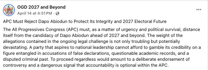 The resort to unverified allegations and character assassination does not strengthen democracy; it weakens it. Ogun State and Nigeria at large deserve a political culture built on ideas, achievements, and constructive debate—not smear campaigns.